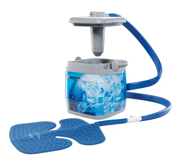 Kodiak to przenośna „lodówka”, do której dodaje się wodę i lód. Urządzenie podłącza się do panelu INTELLI-FLO, który owija się wokół bolesnego miejsca. System automatycznie przepompowuje chłodną wodę przez panel, zapewniając stałą, niską temperaturę i skuteczną ulgę w bólu oraz stanie zapalnym.